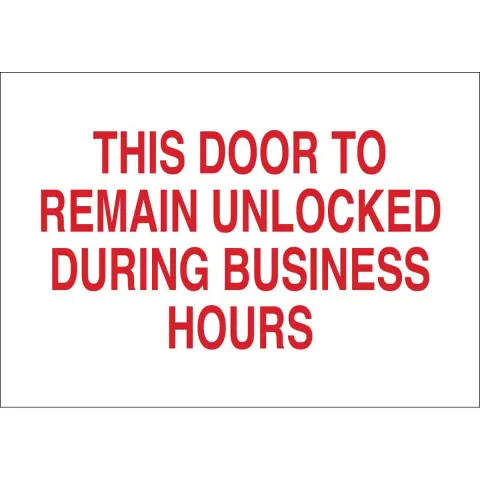 Brady 41123 10 in H x 14 in W Red on White Aluminum Sign "This Door To Remain Unlocked During Business Hours"