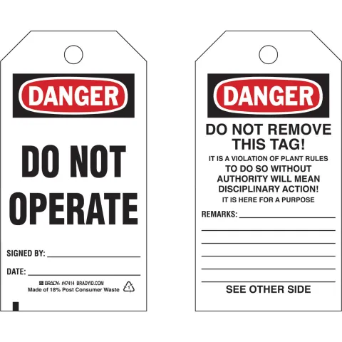 Brady 47488 Accident Prevention Tags "Danger: Do Not Operate Production Department Signed By: Date:" Paper Black Red on White 5.75 in x 3 in