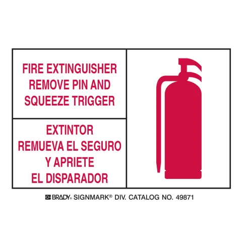 Brady 49871 Label "Bilingual Fire Extinguisher Remove Pin and Squeeze Trigger" B-302 Polyester with Overlaminate 3.5"x5"