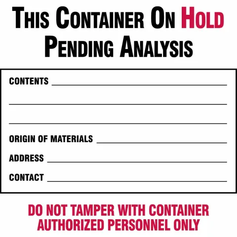 Brady 60366 "This Container on Hold Pending Analysis Contents Origin Of Materials Address Contact" Labels Paper Black Red on White 6 x 6 in