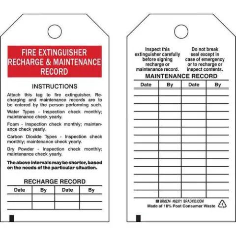 Brady 65371 Tag Fire Extinguisher Recharge and Maintenance Record B-851 Polyester 5.75"x3" Black Red on White 2-Sided 25-Pack