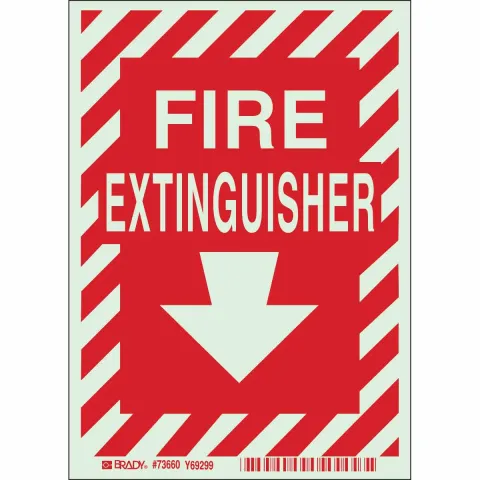 Brady 73660 BradyGlo Sign "Fire Extinguisher" with Arrow Down B-324 Photoluminescent Polyester 7"x5" Red on Glow