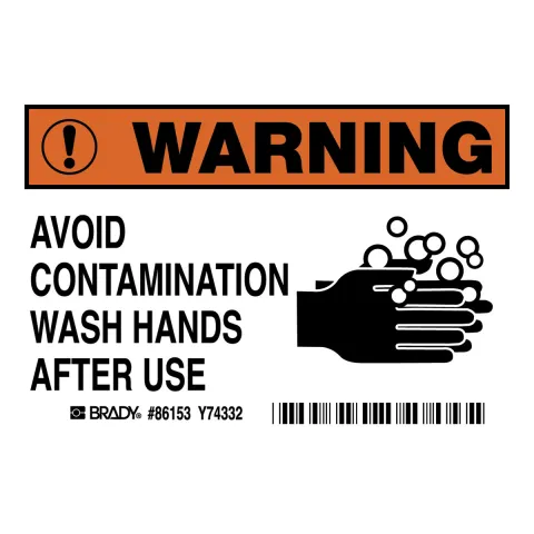 Brady 86153 "Warning Avoid Contamination Wash Hands After Use" Labels Polyester with Polyester Overlaminate Black Orange on White 3.5 x 5 in