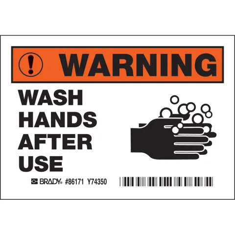 Brady 86171 "Warning Wash Hands After Use" Labels Polyester with Polyester Overlaminate Black Orange on White 3.5" x 5"