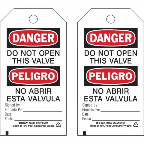 Brady 86523 "DANGER Do Not Open This Valve" Bilingual Accident Prevention Tag, 5.75 x 3", Black, Red on White (Polyester)