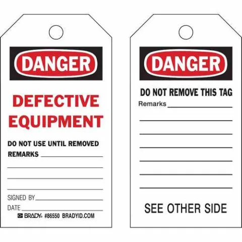 Brady 86715 Tag Accident Prevention Danger Defective Equipment Do Not Use Until Removed B-853 Paper 7"x4" Black Red on White 2-Sided 100-Pack