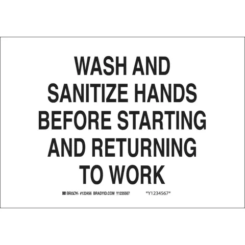 Brady 88682 "Wash and Sanitize Hands Before Starting and Returning to Work" Sign Polyester with Polyester Overlaminate Black on White 7 x 10 in