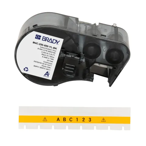 Brady M4C-250-595-YL-BK All Weather Permanent Adhesive Vinyl Label Tape with Ribbon, 0.25" in W x 25 ft L, Black/Yellow, Cartridge of 25 Feet