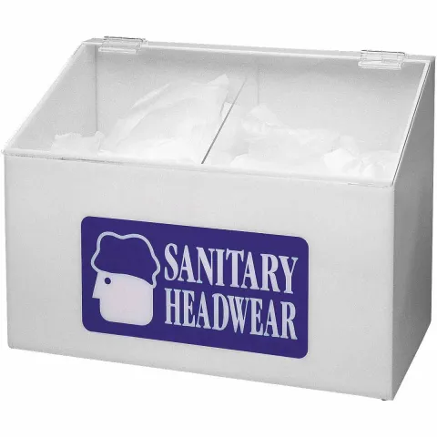 White table top dispenser with clear dust cover has two sections in order to dispense two different kinds of sanitary headwear