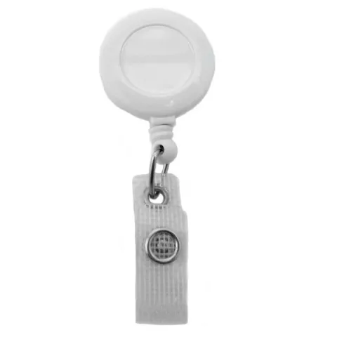 This white round badge reel is made of rugged ABS plastic and features a reinforced vinyl strap, ideal for displaying slotted credentials. A belt clip attaches the reel to the wearer securely.