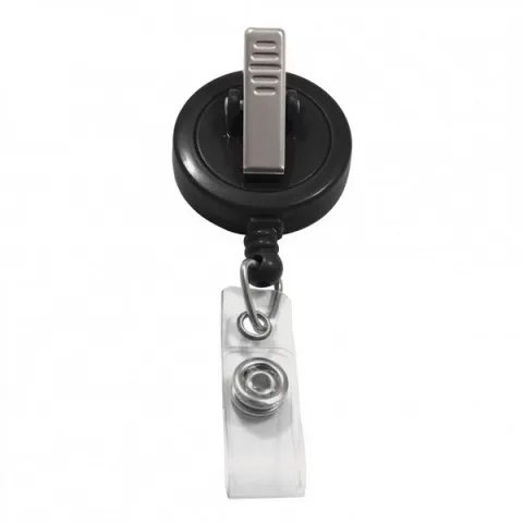 Black round plastic custom badge reel comes with a clear vinyl strap and your choice of swivel clip or slide-type belt clip. Cord has a nylon core with a polyester wrap for added durability.