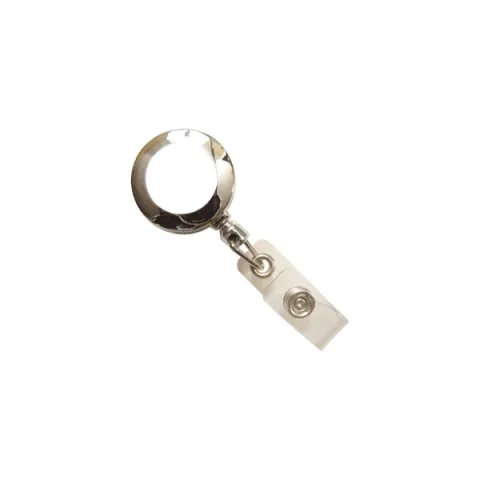 Chrome plastic ABS round badge reel with strap clip for slotted credentials. Chrome finish badge reel with strap end fitting to fit slotted cards. Reel Diameter 1-1/4" (32 mm). Label Size 3/4" (19 mm). Cord measures 34" (864 mm).