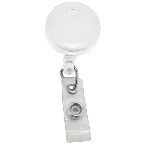 White Round Retractable Badge ID Reel with Strap End Fitting. Reel Diameter 1-1/4" (32 mm). Label Size 3/4" (19 mm). Cord Length 34" (864 mm). White round badge reel for slotted cards.