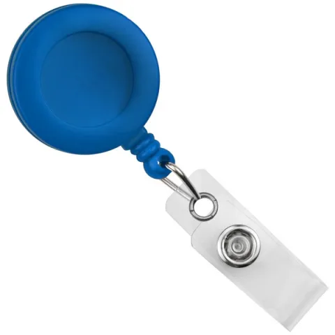 Royal Blue Badge Reel with Strap End Fitting to fit slotted cards. Reel Diameter 1-1/4" (32 mm). Label Size 3/4" (19 mm). Rugged plastic royal blue round badge reel.