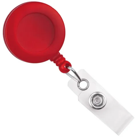 Round plastic pull reel with clear vinyl strap and nylon cord. Metal clip on back swivels to allow for easy wear. Cord has a nylon core with a polyester wrap for added durability.