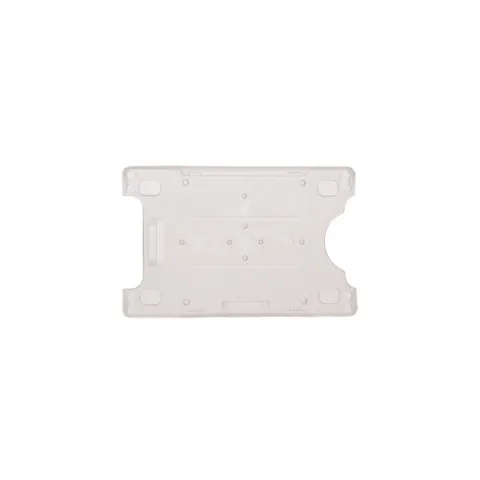 These data/credit card size holders feature an open-face design with side rails to hold ID badge or card securely and a thumb-notch for easy card removal. Tough frosty clear plastic keeps cards from bending. Slot and chain holes can be used to attach holder to lanyard, badge reel or chain either vertically or horizontally