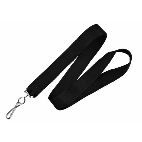 Black flat polyester lanyard is light and comfortable. Non-breakaway style with swivel hook attachment. Lanyard comes sewn as a finishing option.