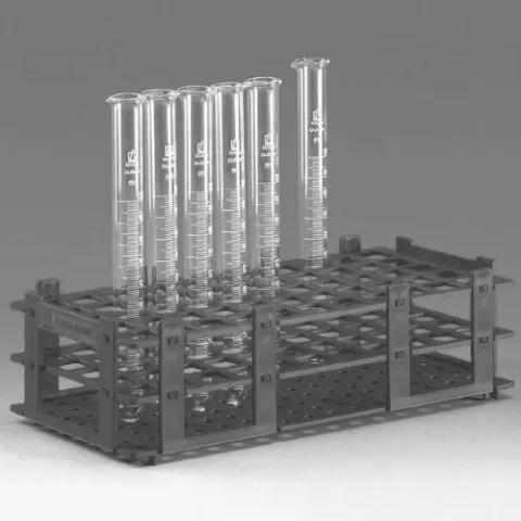 Sturdy construction, stackable. Versatile and inexpensive racks for common diameter test tubes. Filled Polypropylene, density 1.2 g/cm3. Will not float in water bath. Alphanumerical positions for clear sample identification. Wide spaces between positions. Operating temperature -20 to 90 °C. Autoclavable (121 °C). Racks are supplied in three-pieces for convenient and permanent assembly.