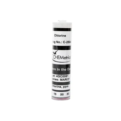 Note: C-2504 Chlorine Comparator is a component of K-2504 Chlorine (free & total) CHEMets Visual Test Kit and is designed to be compared against the color formed in R-2500 CHEMets Refill.