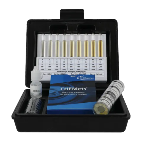 - CHEMets Ammonia Test Kits (K-1510) comes in a plastic case and contains everything needed to perform 30 tests.