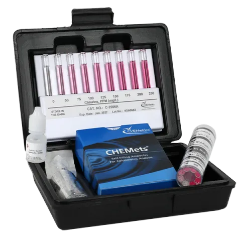- CHEMets Free and Total Chlorine Test Kit (K-2504) comes in a plastic case and contains everything needed to perform 30 tests.