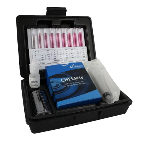 - The K-2520D Chlorine HR CHEMetsTest Kit (0-25 ppm) comes in a plastic case and contains everything needed to perform 30 tests (except distilled water).