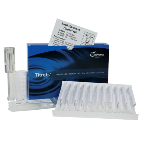 - The K-4585 Total Hardness Titrets Test Kit (100-1000 ppm) comes in a cardboard box and contains everything needed to perform 30 tests: thirty Titrets ampoules with valve assemblies, plastic titrettor, 25 mL sample cup, and instructions. This kit uses the EDTA chemistry to measure the hardness of water by measuring the dissolved minerals in the water. It is designed for applications where high levels of hardness are expected. Results are reported in ppm as CaCO3