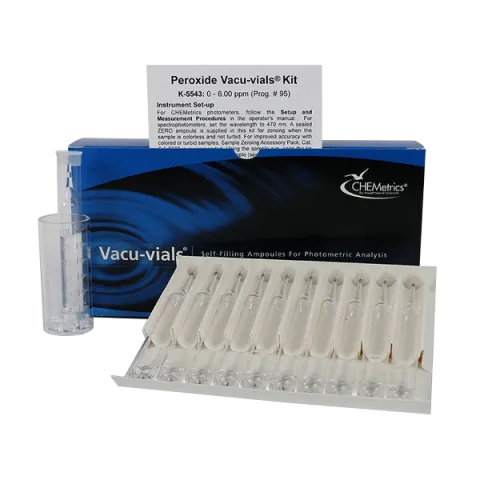 - 0-6.00 ppm Hydrogen Peroxide Test Kit comes in a cardboard box and contains everything needed to perform 30 tests.