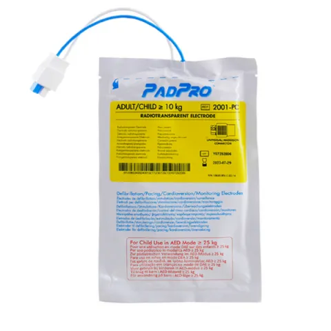 PadPro® has a 36-month shelf life. Adapters allow multiple brands of defibrillators to use the same electrodes. Connection styles are compatible with Zoll and Physio Control style therapy cables. PadPro® electrodes are packaged 1 pair/pouch and 10 pouches (pairs)/case.