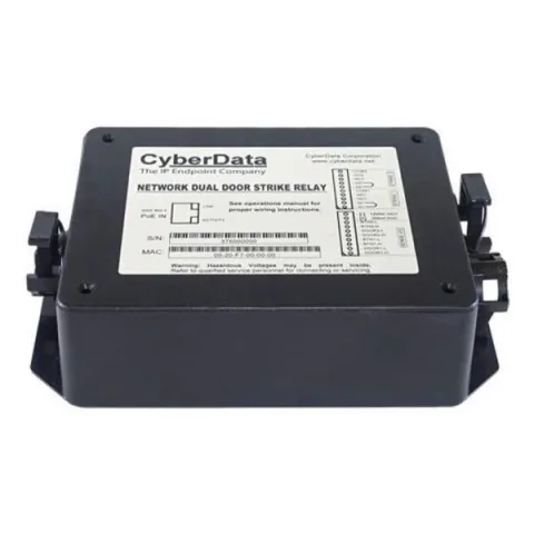 As part of a network-managed security infrastructure, the CyberData Network Dual Door Strike Relay allows monitoring and control of two doors when used in a 'mantrap' or 'airlock' configuration. Power for the strikes can be from the internal 12V at 500 mA supply or from an external source.