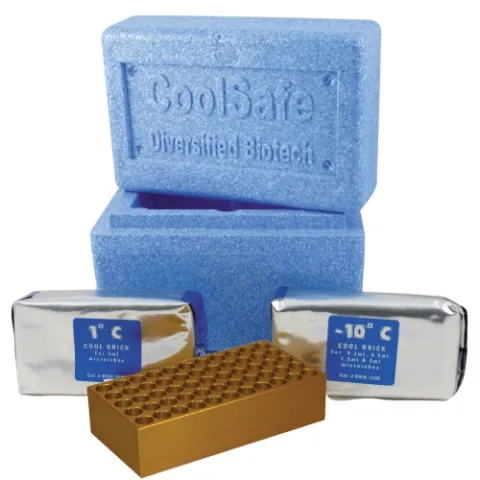 The CoolSafe is a versitile sample cooling system that utilizes re-chargable Cool Bricks (1°C or -10°C), anodized aluminum Cooling Chambers and triple density poly styrene Cool Box, to keep a variety of sample formats cool.