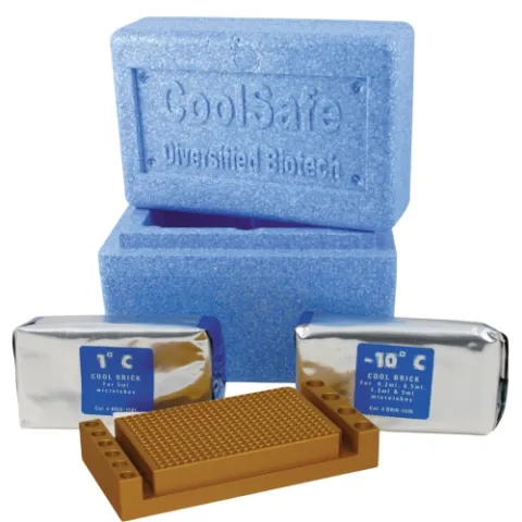 • The CoolSafe is a versitile sample cooling system that utilizes re-chargable Cool Bricks (1°C or -10°C), anodized aluminum Cooling Chambers and triple density poly styrene Cool Box, to keep a variety of sample formats cool.