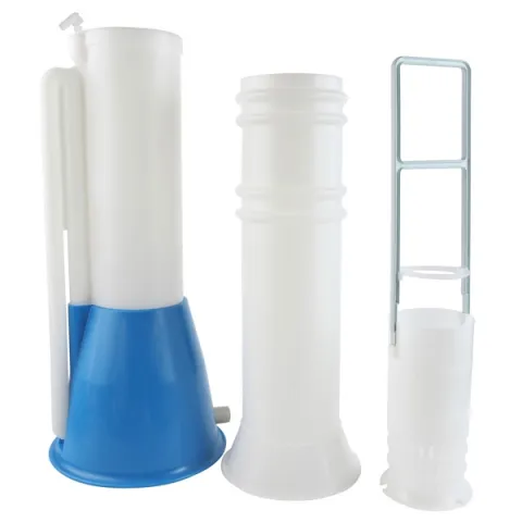 During washing the pipettes/burettes are housed in specially designed PE baskets which minimize breakages as it buffers the tips of pipettes against the soft PE base. Since soaking takes the longest time, two or three baskets of pipettes/burettes can be soaking in their jars whilst another basket full is being washed in the rinser. On the botton connection for outlet tubing (not included; Ø inner tube: 13mm ).