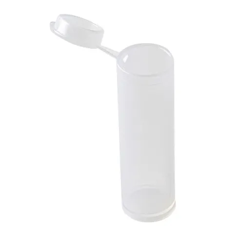 General purpose plastic vial containers with push-in friction fit hinged lids. Lightweight, wall thickness approximately 1 mm. Plastic LDPE Vials withstand temperatures up to 80° C.