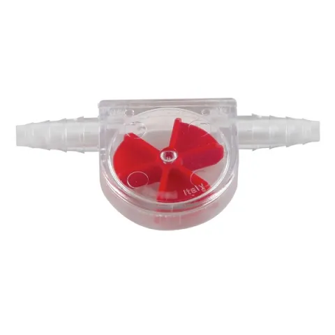 This SAN, bright red paddlewheel flow meter indicates liquid or gas flow from 5 ml/sec to 95 ml/sec. The clear outer case allows for unobstructed view of the wheel which spins freely with flow. Paddlewheel flow indicator is not for use with corrosive fluids or temperature over (185°F) 85°C. Can be used to connect tubing I. D. of 1/4" to 7/16" (6 - 11 mm) I. D.