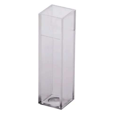 A superior grade of methacrylate provides an excellent degree of light transmission throughout the VIS-UV spectral range from 300 nm to 9000 nm. These cuvettes are ideal for scanning, enzyme rate reactions (with small delta absorbances), and standard curve determinations. These cuvettes have a minimum filling volume of 2.5 ml and a maximum of 4.5 ml.