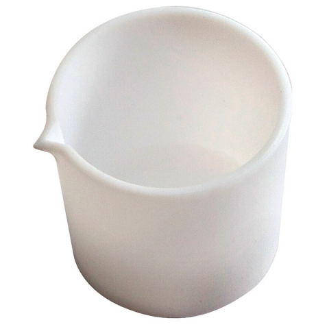 Tall form evaporating dishes with pouring spout are manufactured from pure PTFE with heavy wall. Inert and useable to 260° C. Smooth internal finish. Capacity: 25 mL.