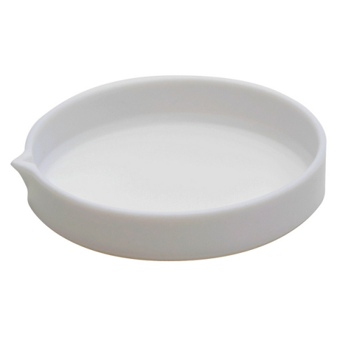 Low form evaporating dishes with pouring spout are manufactured from pure PTFE with heavy wall. Inert and useable to 260° C. Smooth internal finish. Capacity: 50 mL.