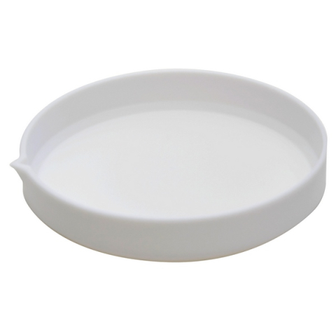 Low form evaporating dishes with pouring spout are manufactured from pure PTFE with heavy wall. Inert and useable to 260° C. Smooth internal finish. Capacity: 180 mL.
