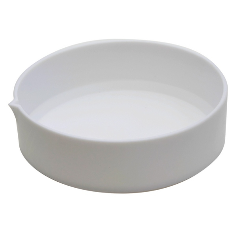 Low form evaporating dishes with pouring spout are manufactured from pure PTFE with heavy wall. Inert and useable to 260° C. Smooth internal finish. Capacity: 400 mL.
