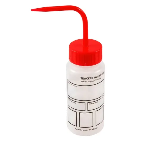 With the Driplok® vent, these LDPE tracker wash bottles are designed to allow for full traceability of solutions. The bottle has been designed with a series of designated labeled areas, including spaces to record the following information: