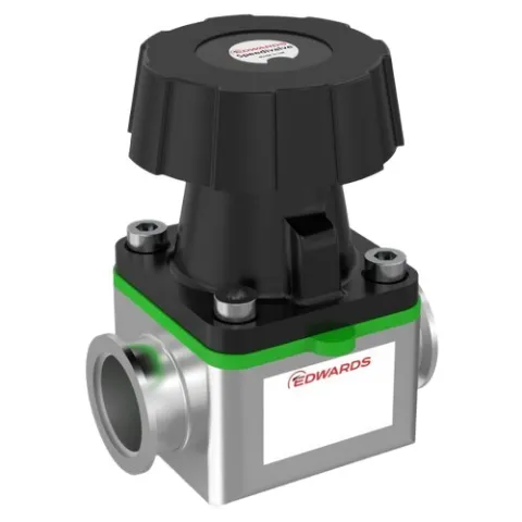 Edwards SP Speedivalves are diaphragm sealed in-line, isolation valves. The construction consists essentially of a flexible elastomeric diaphragm which is sealed onto a lightly polished seat by a screw thread mechanism. The mechanism is isolated from the system by the diaphragm resulting in an extremely rugged and ‘dirty' system tolerant valve.