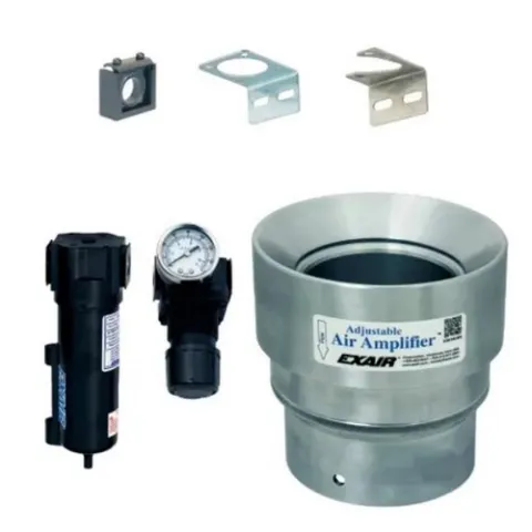 Adjustable Air Amplifier Kits include everything you need to simplify installation. They include an Adjustable Air Amplifier, shim set, filter separator and pressure regulator (with coupler).Adjustable Air Amplifiers pull in large volumes of surrounding air to produce high volume, high velocity outlet flows. Utilizing the Coanda effect, a basic principle of fluidics, Air Amplifiers become a simple, low cost way to circulate air, move smoke, fumes, and light materials. Force and flow for the Adjustable Air Amplifier is changed by turning the exhaust end (with the knurled ring loose) to open or close the continuous air gap. When desired performance is obtained, the knurled ring can be tightened to lock the flow at that setting.