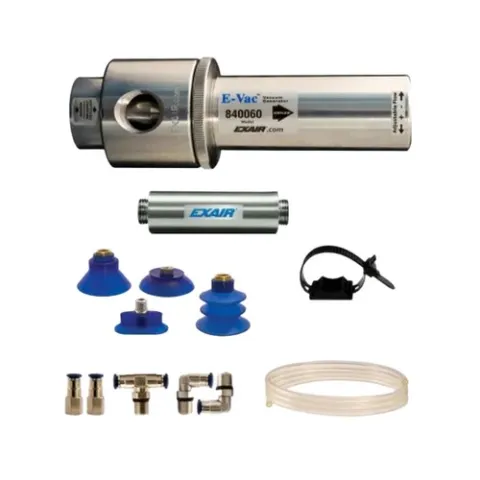 EXAIR's Adjustable E-Vac is compressed air powered vacuum generators where the vacuum and flow rates can be easily adjusted to suit the application requirements. These vacuum pumps are ideal for a wide variety of pick and place, box opening, clamping, lifting, chucking and surface mounting applications. They are maintenance free and have no moving parts to wear out.