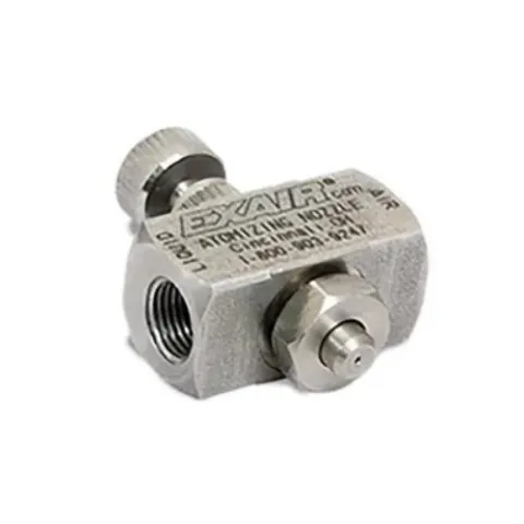 EXAIR's 1/8 FNPT internal mix narrow angle round pattern nozzles are excellent for spraying a concentrated mist of liquid. Because of the versatility of their adjustments, they can apply a heavy coat up close or send a very fine mist over 30 feet away! They are often used for precision application of lubricants during assembly, or marking items as they move through an assembly line. For pressure fed applications not requiring independent air and liquid control.