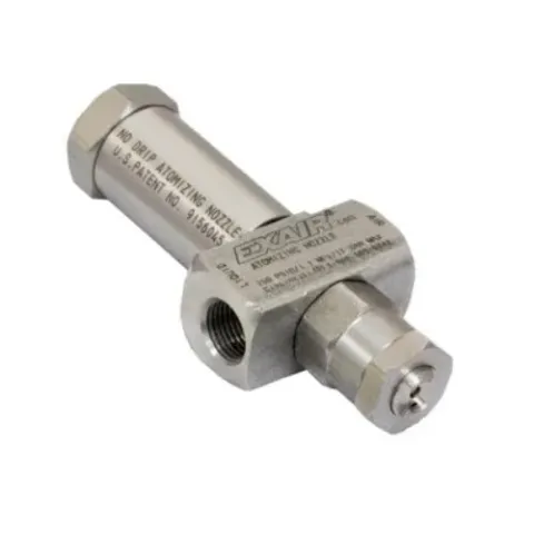 1/8 FNPT no drip external mix narrow angle flat fan pattern nozzles feature their ability to positively stop liquid flow when the compressed air is shut off helps conserve expensive liquids and protects the product finish from drips. They are great where a high volume of liquid is needed over a concentrated area. Since they are external mix, airflow and liquid flow can be controlled independently. External mix narrow angle flat fan pattern nozzles are the best choice where thicker liquids for a heavy coating are needed over a narrow band, such as a paint line. Made from 303SS for corrosion resistance. For pressure fed applications with independent air and liquid control.