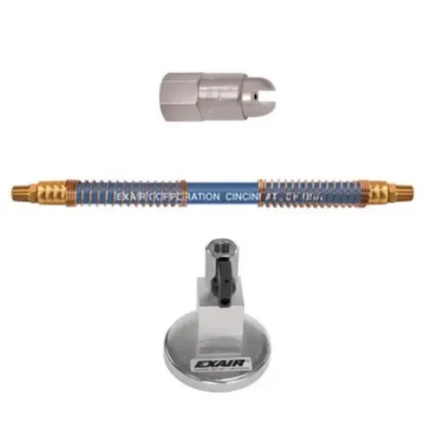 The Safety Air Nozzle with Stay Set Hose and Mag Base includes EXAIR's Flexible Stay Set Hose for applications where repositioning or aiming is required and a One Outlet Magnetic Base for firm attachment to metallic machinery. EXAIR's High Power Safety Air Nozzle provides strong blowing force for applications requiring high thrust and velocity. It uses more compressed air than other air nozzles but is low when compared to typical blowoffs delivering the same force.