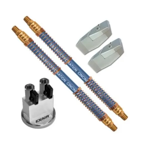 The 2" High Power Flat Super Air Nozzle with Stay Set Hose and Mag Base includes EXAIR's Flexible Stay Set Hose for applications where repositioning or aiming is required and a Two Outlet Magnetic Base for firm attachment to metallic machinery. EXAIR's 2" High Power Flat Super Air Nozzles produce a flat 2" (51mm) wide airstream with a strong blowing force of 2.2 pounds (1,134 grams). The adjustable force is more than three times that of ordinary air nozzles. It uses EXAIR's patented technology to maximize entrained airflow while reducing noise levels.