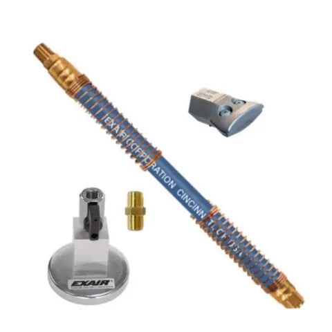 The 1" High Power Flat Super Air Nozzle with Stay Set Hose and Mag Base includes EXAIR's Flexible Stay Set Hose for applications where frequent repositioning is required and a One Outlet Magnetic Base for firm attachment to metallic machinery. EXAIR's 1" High Power Flat Super Air Nozzles produce a flat 1" (25mm) wide airstream with a blowing force of 1 pound. The unique design of this super-efficient nozzle makes it an ideal fit for both tight spaces and tight budgets. It uses EXAIR's patented technology to maximize entrained airflow while reducing noise levels.