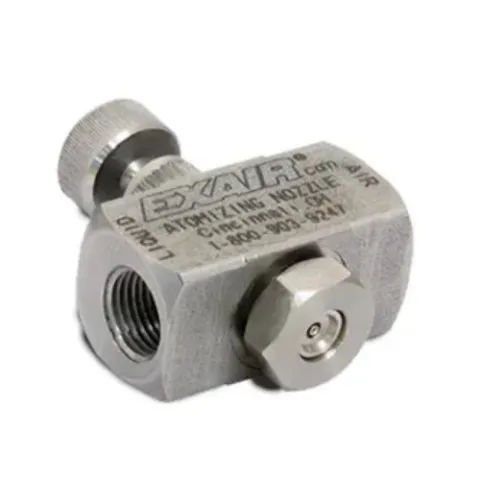 EXAIR's 1/8 FNPT siphon fed round pattern nozzles are great where no liquid pressure is available and a thin coating is needed at a specific area. Flow rate is adjustable via the adjusting valve. Siphon nozzles work best with a suction height of 36" (914mm) or less. Since these nozzles are siphon fed, the compressed airflow draws the liquid in and mixes it internally. Liquid flow is dependent both on the gravity or suction height and the airflow. Siphon fed round pattern nozzles provide the most liquid flow of any siphon fed nozzle.